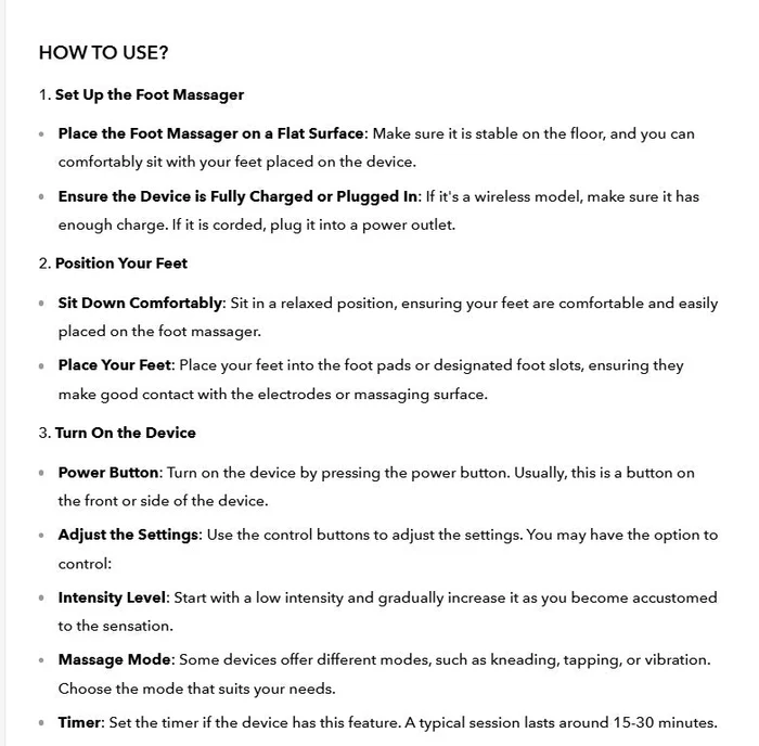 - Place the massager on a flat surface where you can sit comfortably and rest your feet.
